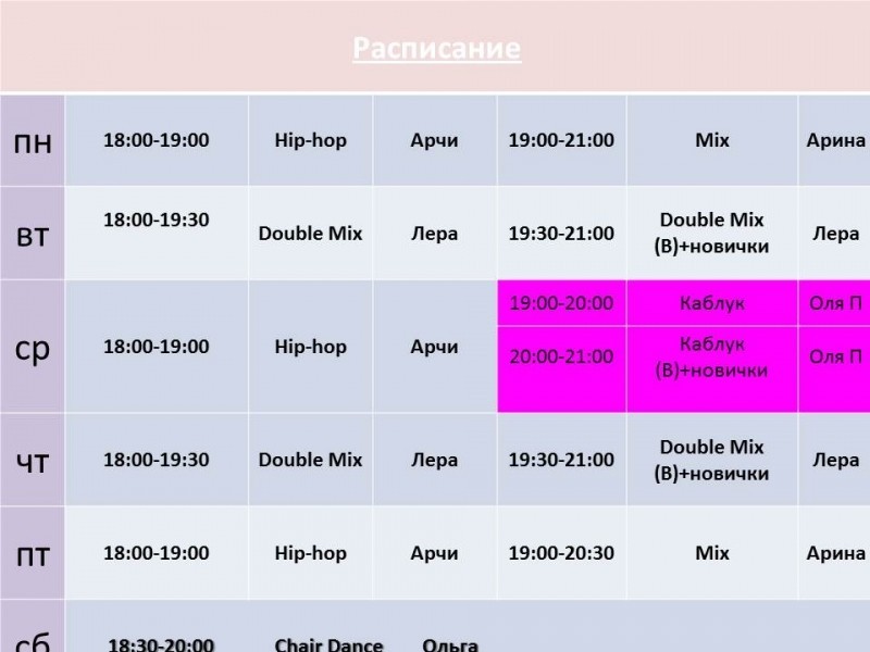 Обращаем ваше внимание на изменения в расписании!) Клиенты, которые пришли познакомиться с нашей системой по купону могут посещать только тренировки с пометкой B (Biglion).Купон действителен до 5 ноября. Купон не действует в случае, если вы когда-либо занимались в нашей студии). Для остальных система не меняется-вы можете посещать любые тренировочки (хоть каждый день), в том числе и группы с пометкой B. В среду каблук – не забываем туфли!) Забывашки качают пресс на 100 раз больше)))